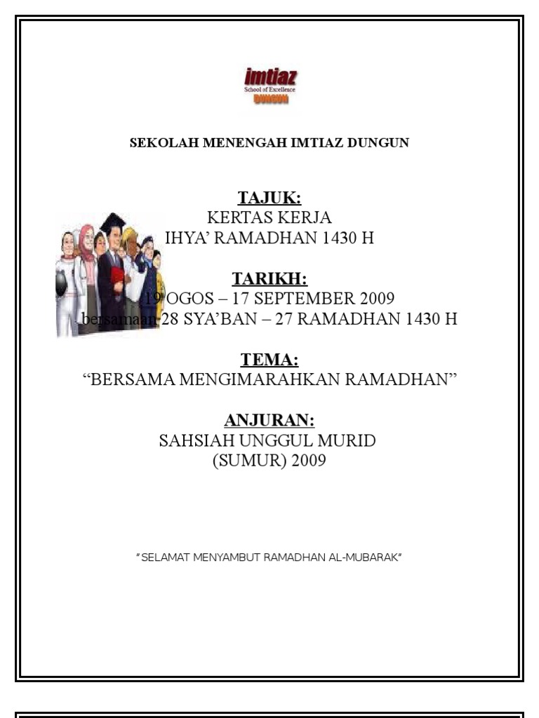 Selain itu, masih banyak lagi hikmah puasa yang akan didapat. Keistimewaan ramadhan tercermin dalam hadits yang diriwayatkan imam bukhari Umat islam seharusnya menerima kehadiran. Sekolah kebangsaan bukit gelugor jalan yeap chor ee, 11700 gelugor, pulau pinang. Kertas kerja ihya' ramadhan tarikh: Last updated on august 4, 2017 by tongkrongan islami. Text of kertas kerja ihya` ramadhan 2015.docx. Rencana kerja jangka menengah atau pupuler disebut (rkjm) untuk jenjang sekolah dasar adalah artikel yang akan saya bahas pada kesempatan kali ini. Pelancaran ihya' ramadhan 1434 h(9 julai 2013)documents. Allah swt menjadikan semua yang ada di bumi sebagai lapangan untuk mencari rezeki atau kehidupan. Bulan yang sentiasa dinantikan kerana ia dipenuhi dengan keberkatan dan kerahmatan. Menghemat kertas di sekolah merupakan cara yang baik untuk membantu melestarikan lingkungan. Sebentar lagi, bulan suci ramadhan akan segera datang dan umat islam akan melaksanakan ibadah puasa.