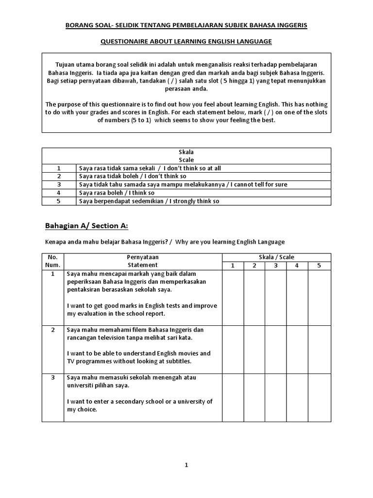 Borang Soal Selidik In English / Lima orang pensyarah dari fakulti pengurusan dan pembangunan sumber.. Borang kaji selidik merupakan borang yang berisi soalan dan juga tersedia ruangan untuk jawapan di mana satu sampel borang yang sama digunakan untuk kesemua responden. Borang soal selidik geografi pt3 2017. Savesave borang soal selidik for later. So please help us by uploading 1 new document or like us to download Hantar soal selidik ini bersama dengan laporan profail usahawan tersebut.