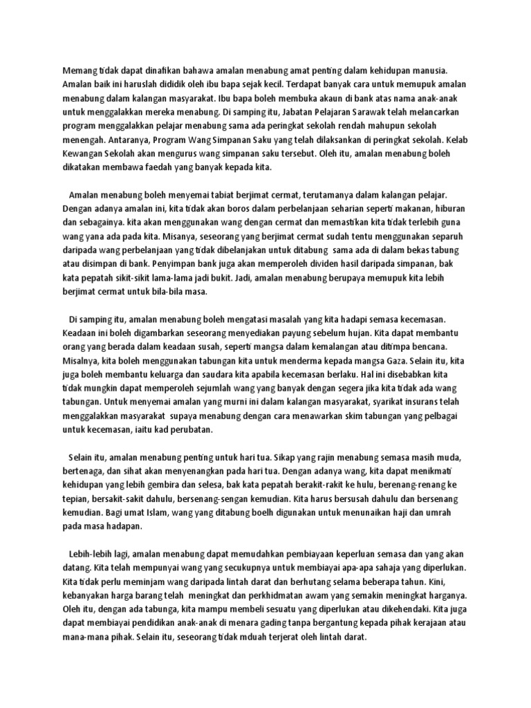 at pada realitinya, memang tidak dapat dinafikan bahawa amalan menabung sebenarnya dapat memupuk sikap berjimat cermat dalam kalangan masyarakat di negara kita.